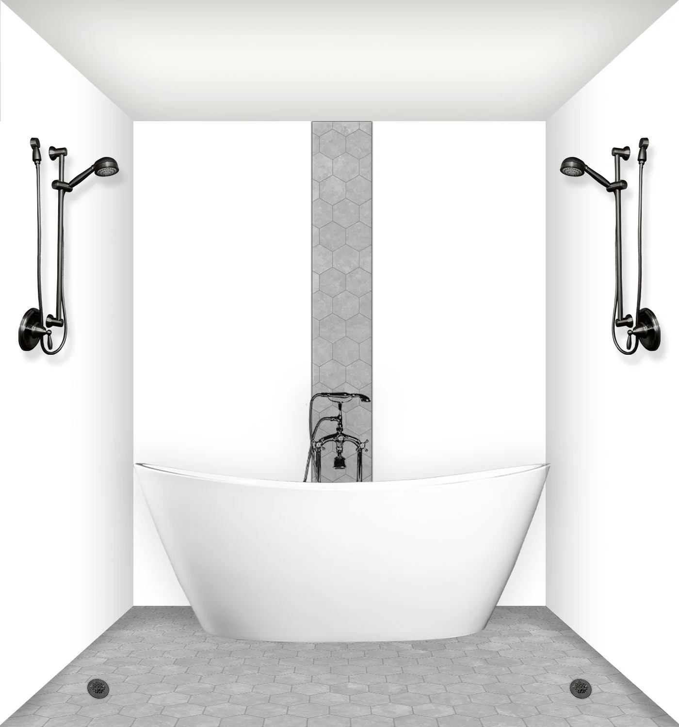 White Shower Surround with Washed Concrete 6 Inch Hexagon Accent Strip and Shower Floor